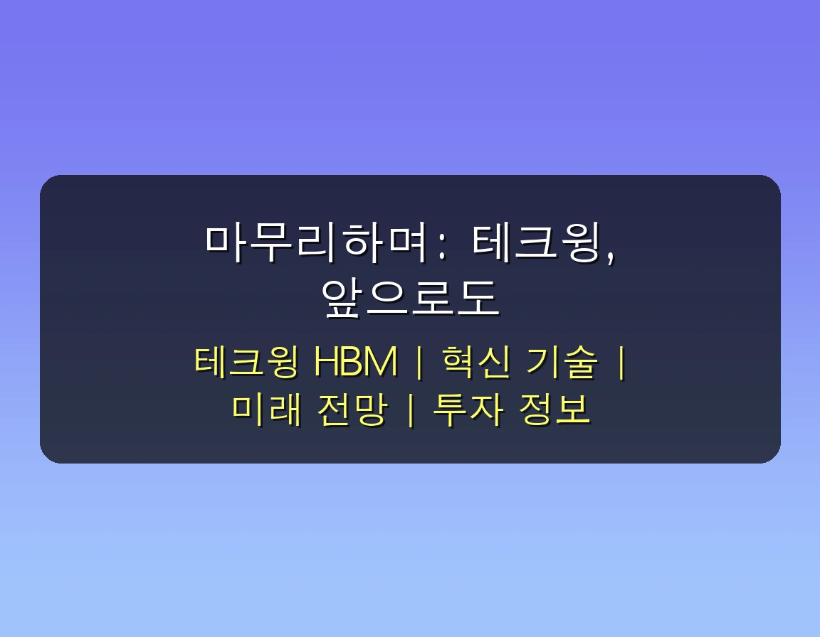 앞으로 테크윙이 HBM 시장에서 어떤 새로운 성공 스토리를 써 내려갈지, 그리고 그 기술력을 바탕으로 또 어떤 도전에 나설지 기대가 됩니다. 혹시 테크윙에 대해 더 궁금한 점이 있다면, 댓글로 자유롭게 질문해주세요! 함께 정보를 공유하며 더 깊이 있는 인사이트를 얻어가요. 😊 본 글이 유익하셨다면 좋아요와 팔로우 부탁드립니다! 다음에도 더욱 알찬 투자 정보로 돌아오겠습니다. 감사합니다! 🙌