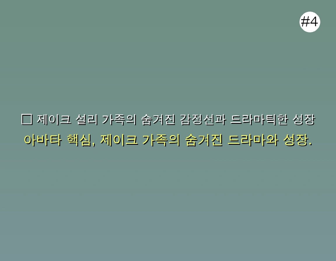 이 가족이 겪는 사랑, 상실, 그리고 성장의 이야기는 판도라의 거대한 서사 속에서 더욱 감동적으로 펼쳐질 것입니다. "아바타3"를 보기 전 각 캐릭터의 배경과 심리를 이해하면, 훨씬 더 깊은 몰입감을 느낄 수 있을 것입니다.