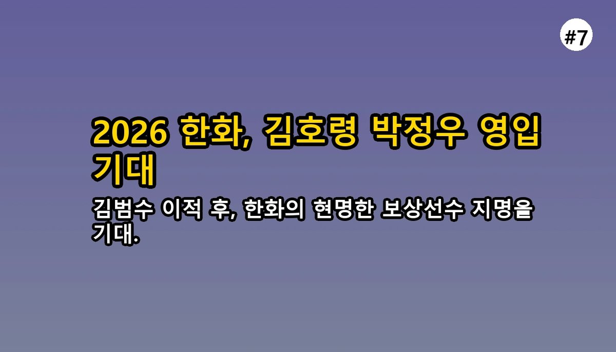 - 김범수 FA 이적: 한화 김범수 선수가 KIA 타이거즈로 FA 이적하며 한화는 보상선수를 지명합니다.
