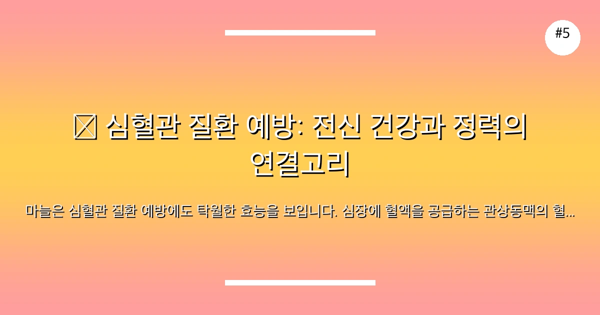 마늘은 심혈관 질환 예방에도 탁월한 효능을 보입니다. 심장에 혈액을 공급하는 관상동맥의 혈전 형성을 억제하고 혈중 호모시스테인 수치를 낮추어 심장 건강을 증진시킵니다. 건강한 심혈관 시스템은 전신 건강의 기본이며, 이는 곧 남성의 활력과 정력으로 이어집니다. 마늘 섭취는 장기적인 관점에서 남성 건강 유지에 필수적입니다.