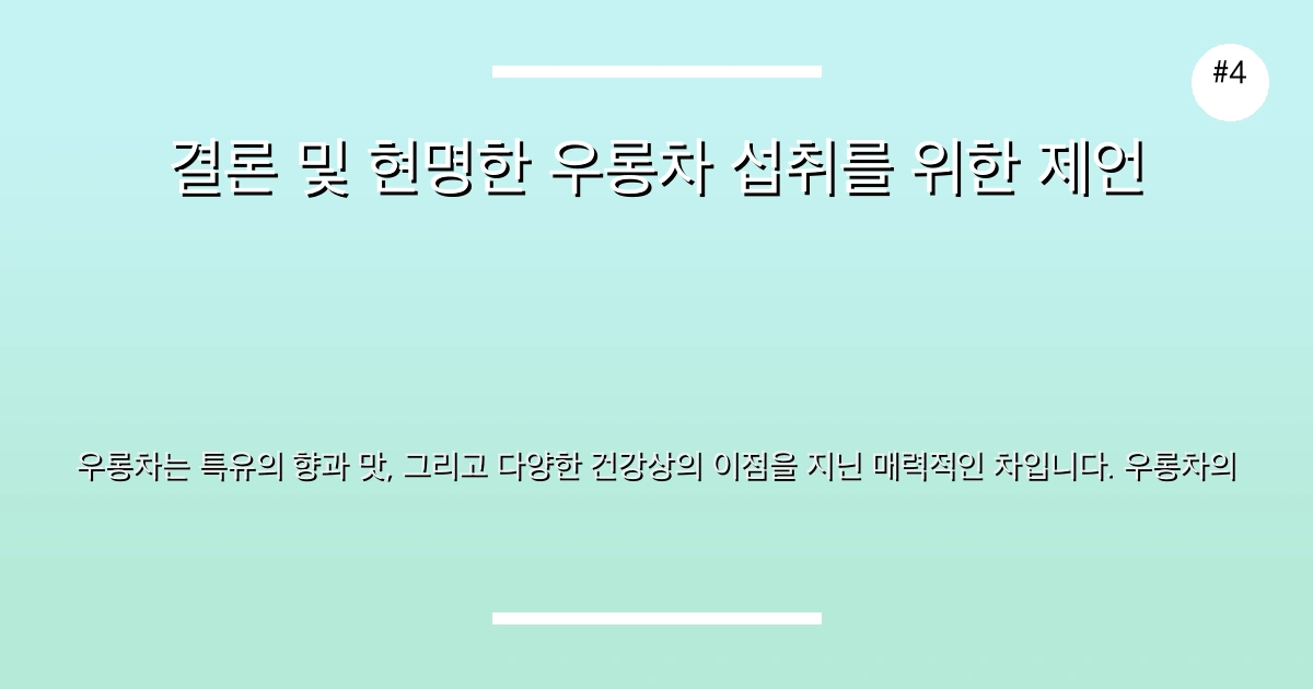 💡 전문가 인사이트: 우롱차는 소화 촉진, 항산화 효과, 체중 조절에 도움을 줄 수 있지만, 개인의 몸 상태와 카페인 민감도를 고려하여 적당량을 마시는 것이 중요합니다. 특히 임산부나 특정 질환을 가진 분들은 전문가와 상담 후 섭취하는 것이 바람직합니다.