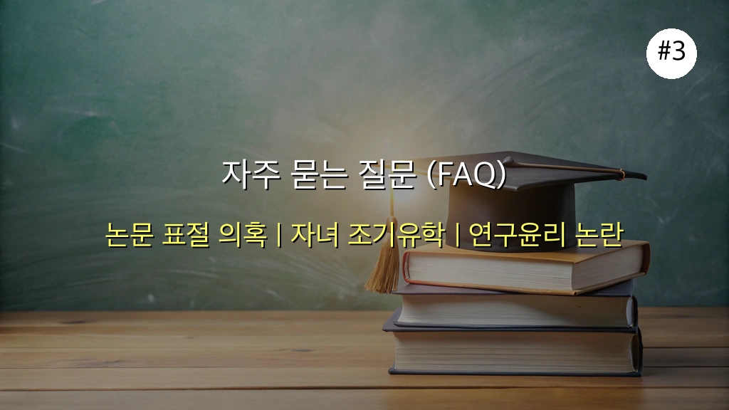 | 주요 내용 | 본인 학술 논문이 제자 논문과 높은 유사성, 인용 미표기 | 자녀 의무교육 기간 중 미국 조기유학, 법 위반 소지 |