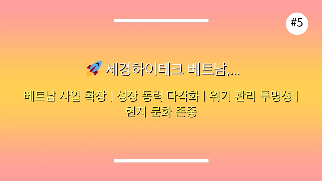 세경하이테크의 베트남 사업은 2025년 예상되는 재무 성장을 넘어, 동남아시아 시장에서 새로운 성장 동력을 확보하고 사업 포트폴리오를 다각화하는 중요한 전략적 움직임입니다. 베트남의 강력한 전자 및 반도체 산업 육성 정책은 이러한 투자의 성공 가능성을 더욱 높이고 있습니다. 그러나 해외 사업은 단순히 경제적 이익 추구를 넘어, 현지 사회와의 조화와 기업의 사회적 책임 이행이 중요합니다. 최근 발생한 사건에서 보듯이, K-기업이 글로벌 시장에서 진정한 리더십을 발휘하기 위해서는 투명한 위기 관리 능력과 함께 현지 문화에 대한 깊은 이해와 존중이 필수적입니다. 세경하이테크가 베트남에서 성공적인 미래를 그려나가기 위해서는 기회를 극대화하고 도전을 현명하게 관리하는 균형 잡힌 전략이 필요할 것입니다.