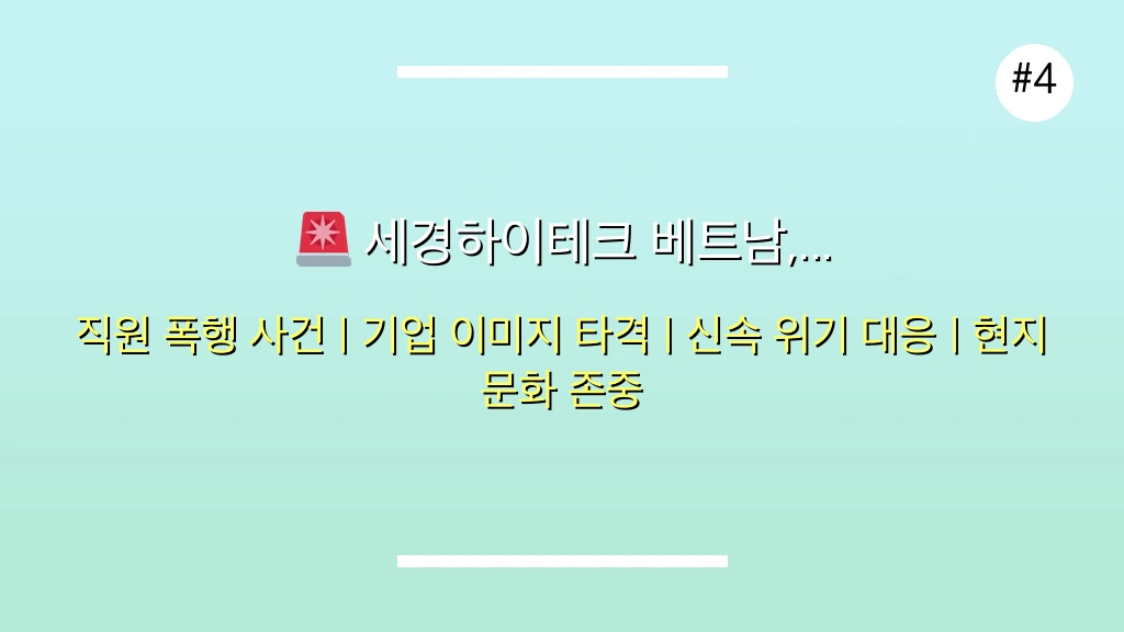 세경하이테크의 베트남 사업 확장에 청신호만 있는 것은 아닙니다. 2025년 7월, 베트남 현지에서 발생한 한국인 직원의 폭행 사건은 세경하이테크의 기업 이미지와 평판에 적지 않은 타격을 주었습니다. 해당 직원은 즉시 퇴사 조치되었고, 회사는 공식 사과문을 발표하며 신속하게 대응했습니다. 이러한 사건은 해외에 진출한 K-기업들이 직면할 수 있는 중요한 리스크 중 하나로, 현지 문화 존중과 철저한 직원 교육, 그리고 위기 발생 시의 투명하고 빠른 대응이 얼마나 중요한지를 보여주는 사례입니다. 글로벌 기업으로서 사회적 책임과 현지 사회와의 조화로운 관계 구축은 지속 가능한 성장을 위한 필수 요소입니다.