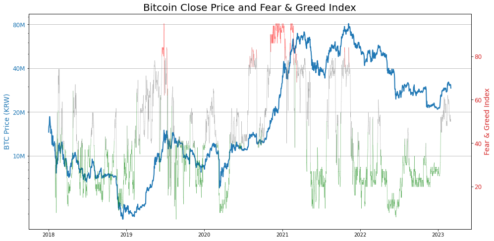 왼쪽 y축은 비트코인의 가격(KRW)을 나타내고, 오른쪽 y축은 공포탐욕지수를 나타냅니다.