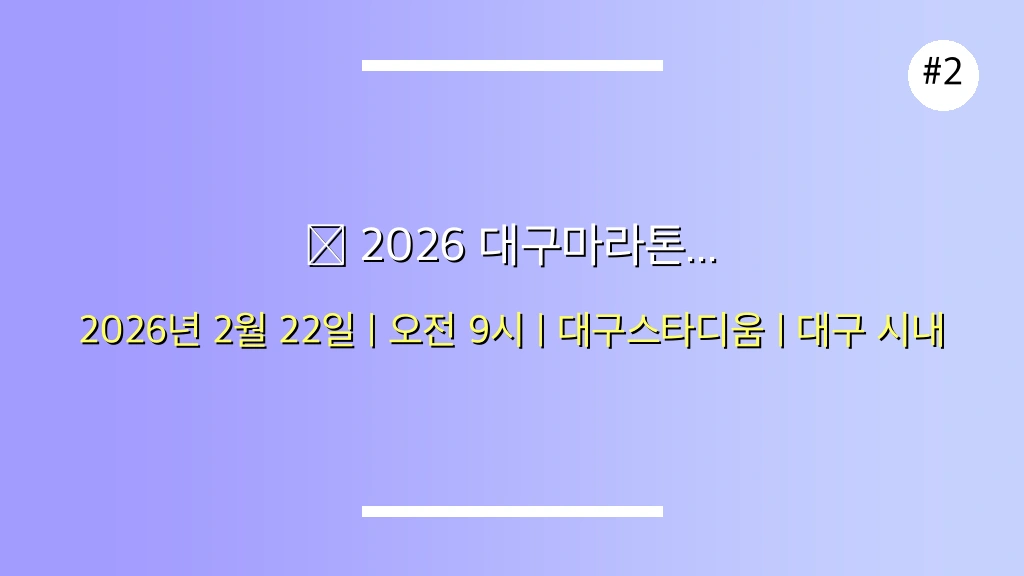 2026년 대구마라톤 대회는 2026년 2월 22일(일) 오전 9시에 성대한 막을 올립니다. 대회 개최 장소는 마라톤의 열기를 담아낼 대구스타디움과 대구의 아름다운 풍경을 만끽할 수 있는 대구 시내 일원입니다.