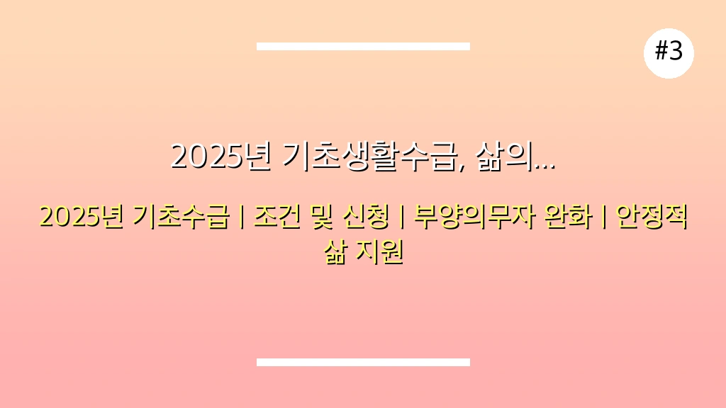💡 전문가 인사이트: 2025년 기초생활수급자 제도의 가장 큰 변화는 부양의무자 기준의 추가 완화입니다. 이는 그동안 부양의무자 때문에 복지 혜택에서 소외되었던 취약계층에게 희망적인 소식입니다. 정확한 최신 중위소득 기준은 보건복지부 고시를 통해 확인하는 것이 가장 중요합니다.