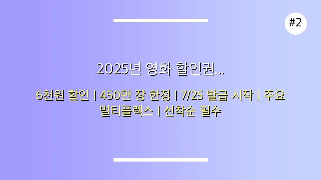 할인권은 선착순으로 배포되므로 7월 25일 오전 10시부터 서둘러 발급받는 것이 중요하며, 온라인 예매 필수, 특별관 적용 가능, 제휴 카드 중복 할인 등의 꿀팁을 적극 활용하여 현명한 영화 관람 계획을 세우시길 바랍니다. 이 특별한 기회를 통해 문화생활의 즐거움을 더욱 풍성하게 누리세요!