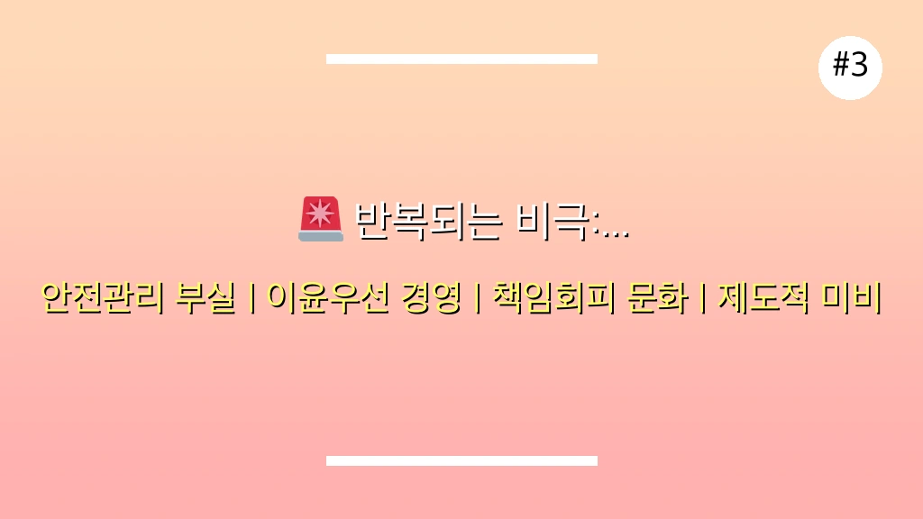 - 총체적인 안전 문화 부재: 기업 전반에 '안전은 비용이 아닌 투자'라는 인식이 부재하며, 사고 발생 시 책임 전가에 급급한 태도가 반복됩니다.