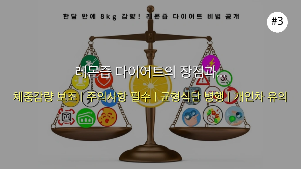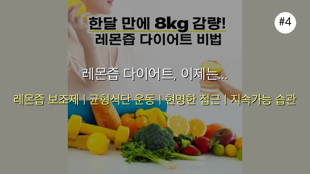 💡 전문가 인사이트: 단기간의 급격한 체중 감량은 건강에 무리를 줄 수 있으며, 요요 현상으로 이어질 가능성이 높습니다. 레몬즙 다이어트는 건강한 생활 습관의 보조 수단으로 활용하고, 장기적인 관점에서 균형 잡힌 식단과 꾸준한 운동을 병행하는 것이 중요합니다.