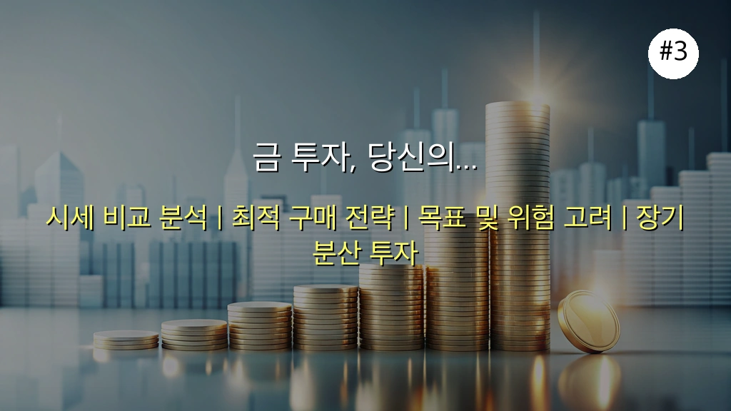실물 자산 보유(골드바, 금반지 등)를 원한다면 금은방, 은행 등 국내에서 직접 구매하는 것이 편리합니다. 반면, 세금 혜택을 고려한 소액 투자를 원한다면 KRX 금시장을 통한 거래가 유리하며, 환율 및 국제 시세 변동성에 직접 베팅하려면 해외 금 ETF나 선물 투자를 고려할 수 있습니다. - 3단계: 장기적인 관점과 분할 매수 전략 활용하기