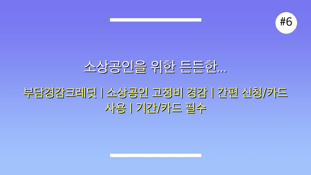 부담경감크레딧은 소상공인의 고정비용 부담을 실질적으로 줄여줄 수 있는 2025년 한시적 지원 제도입니다. 온라인으로 간편하게 신청하고, 평소 공과금 및 4대 보험료를 납부하는 지정 카드로 결제 시 자동 차감되는 방식이므로 사용방법 또한 매우 간편하다는 장점이 있습니다.