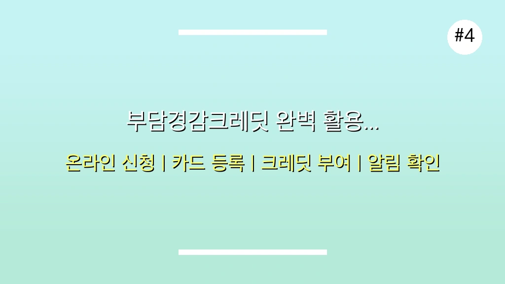 부담경감크레딧은 2025년 12월 31일까지 사용 기한이 정해져 있습니다. 미사용 잔액은 해당 기한 이후 자동으로 소멸되므로, 주기적으로 크레딧 잔액과 사용 내역을 확인하여 효율적으로 사용하는 것이 중요합니다. 만약 공과금이나 4대 보험료 자동이체가 계좌로 설정되어 있다면, 등록된 카드로 자동이체 방식을 변경하여 혜택을 놓치지 않는 것을 강력히 권장합니다. - 5단계: 카드 변경 시 반드시 재신청