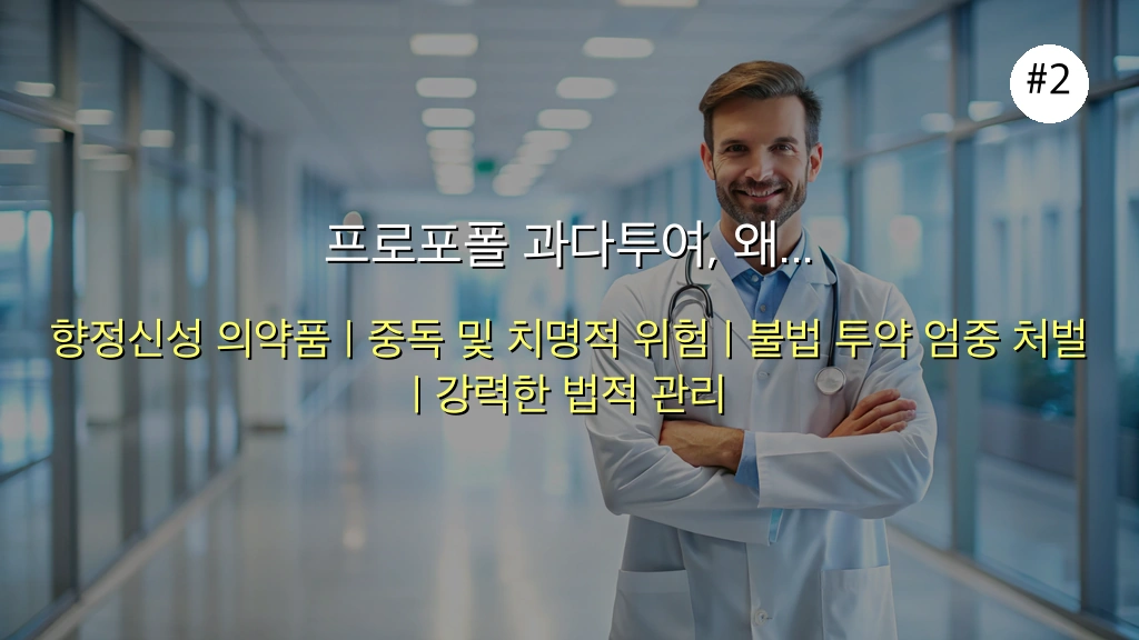 💡 전문가 인사이트: 프로포폴은 엄격히 관리되는 마약류이며, 과다투여는 환자 생명에 치명적 위험을 초래할 수 있으므로 의료진은 투약 기준을 철저히 준수해야 합니다. 불법 오남용 시 강력한 법적 처벌을 피하기 어렵습니다.