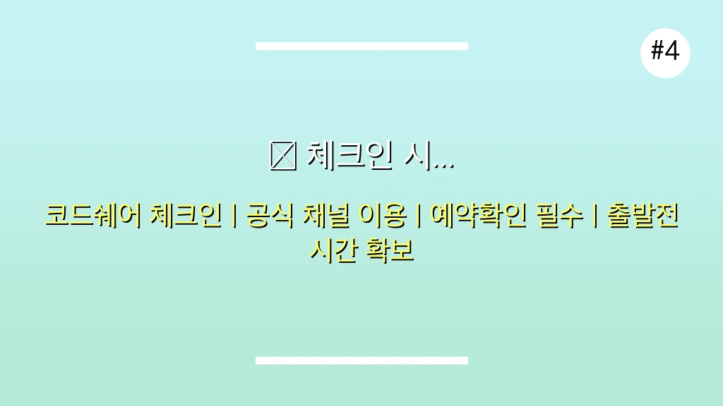 - 코드쉐어 항공편 유의: 예약 전에 반드시 항공사별 체크인 절차를 확인하고, 필요 시 항공사 카운터 방문을 고려하세요. 특히, 국제선의 경우 출발 3시간 전 체크인을 권장하며, 시간에 맞춰 준비하는 것이 중요합니다.