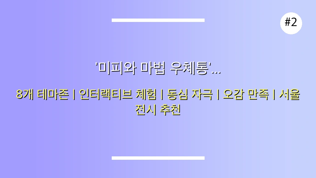 💡 '미피와 마법 우체통' 전시는 아이들의 오감을 자극하는 다채로운 미디어아트와 체험 요소로 가득하여, 아이와 가볼 만한 서울 전시회로 적극 추천할 만했습니다.