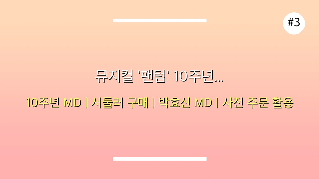 A: 10주년 기념 MD는 일반적으로 프로그램 북, 포토 카드, 키링, 의류 등 다양하게 출시됩니다. 박효신 배우 관련 MD는 팬들 사이에서 인기가 매우 높으므로, 공연 관람 전에 현장 MD 판매 정보를 미리 확인하거나 온라인 사전 판매를 이용하는 것이 좋습니다. 한정 수량인 경우가 많으니 서두르는 것이 좋습니다.