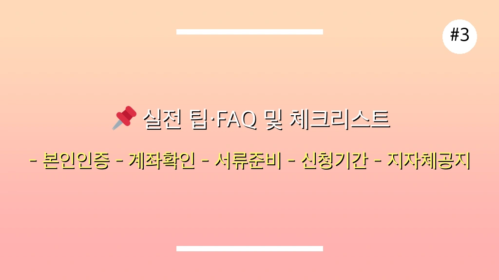 실제 신청은 신청방법별로 필요한 절차가 다르므로 아래 3단계로 요약해 단계별로 준비하세요. 1단계: 대상 여부 확인 — 가구원 수·월소득·자산 기준을 정부 공지 또는 지자체 페이지에서 확인합니다. 2단계: 신청 수단 선택 — 온라인(정부24, 보조금24, 지자체 포털, 금융앱) 이용을 권장합니다. 인증서(공동·금융·민간)로 본인 인증 후 개인정보 제공 동의 및 지급계좌 입력을 완료하면 신청 접수가 됩니다. 3단계: 신청 완료 확인 및 사후관리 — 접수 문자·앱 알림, 정부24 신청내역 확인으로 처리 상태를 모니터링하고, 오입력 시에는 즉시 지자체에 연락해 수정 절차를 안내받으세요. 대리 신청의 경우 위임장과 신청서, 대리인 신분증을 지참해야 하며, 찾아가는 서비스는 거동 불편자·고령자에게 지자체가 제공하므로 사전 예약이 필요합니다.