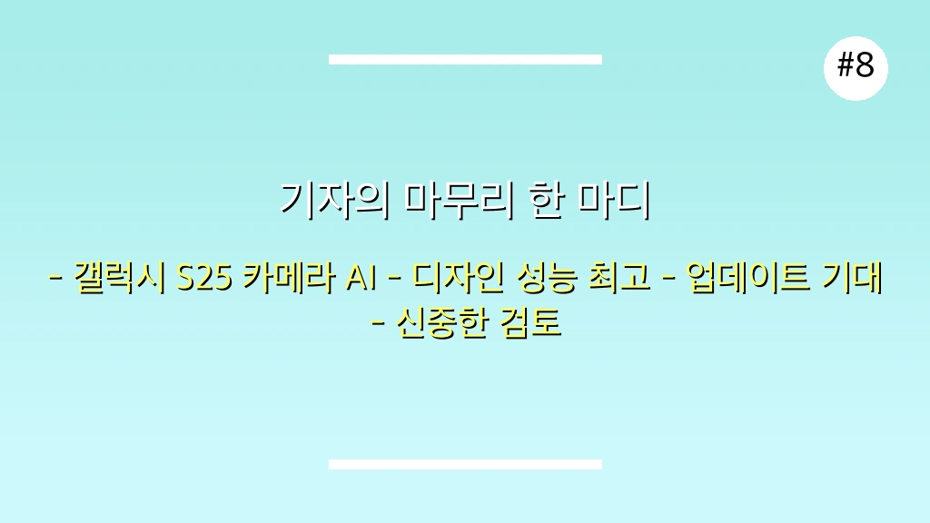 핵심 쟁점: 갤럭시 S25는 디자인과 성능 면에서 현존 최고 수준을 자랑하지만, 카메라 줌 성능과 AI 기능의 신뢰성은 향후 업데이트를 통해 더욱 개선될 여지가 있습니다.