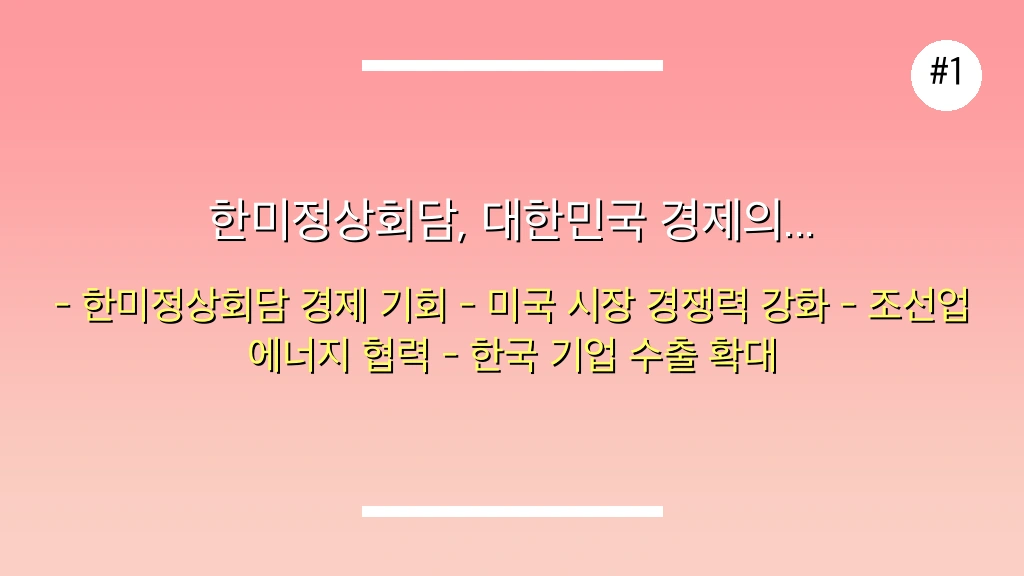 이번 한미정상회담은 단순한 외교적 만남을 넘어, 대한민국 경제에 새로운 활력을 불어넣을 중요한 전환점이 될 가능성을 보여주었습니다. 마치 오래 기다려온 기회가 현실로 다가온 것처럼, 우리 기업들의 미국 내 경쟁력을 한 단계 끌어올릴 절호의 기회가 왔다고 해도 과언이 아닙니다.