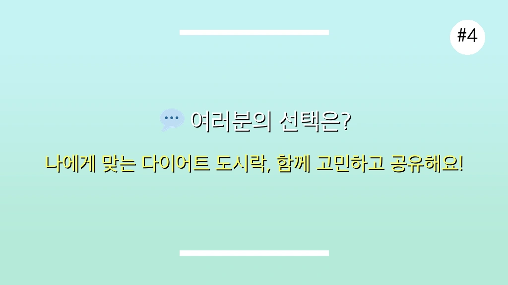 혹시 여러분은 랭킹닭컴 '맛있닭'과 굿스푼 '냉동밥' 중 어떤 제품을 더 선호하시나요? 혹은 여러분만의 특별한 다이어트 도시락 추천이 있다면 댓글로 공유해주세요. 여러분의 소중한 경험과 생각을 나누며 서로에게 유용한 정보를 얻는 것은 어떨까요?
