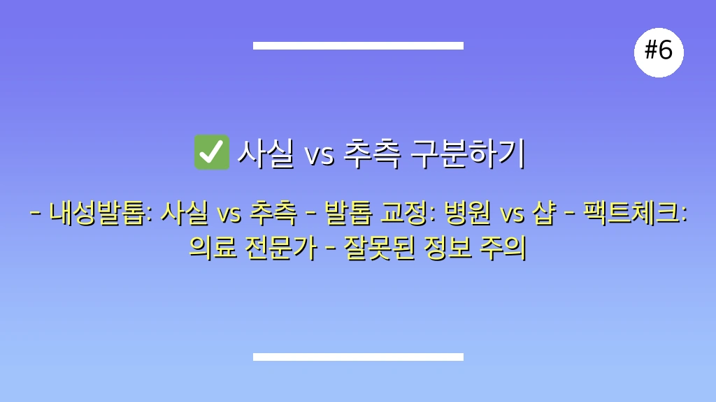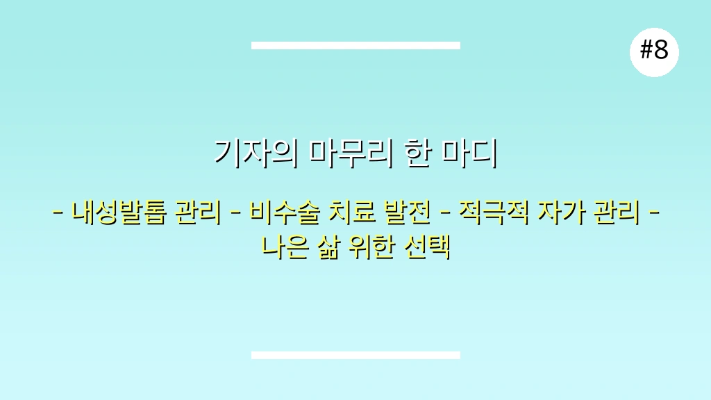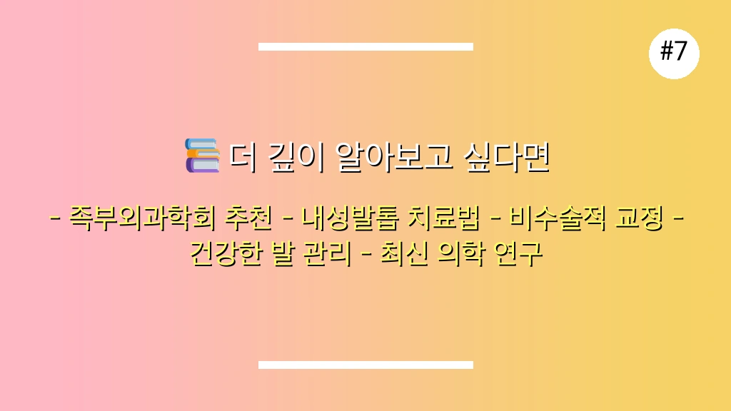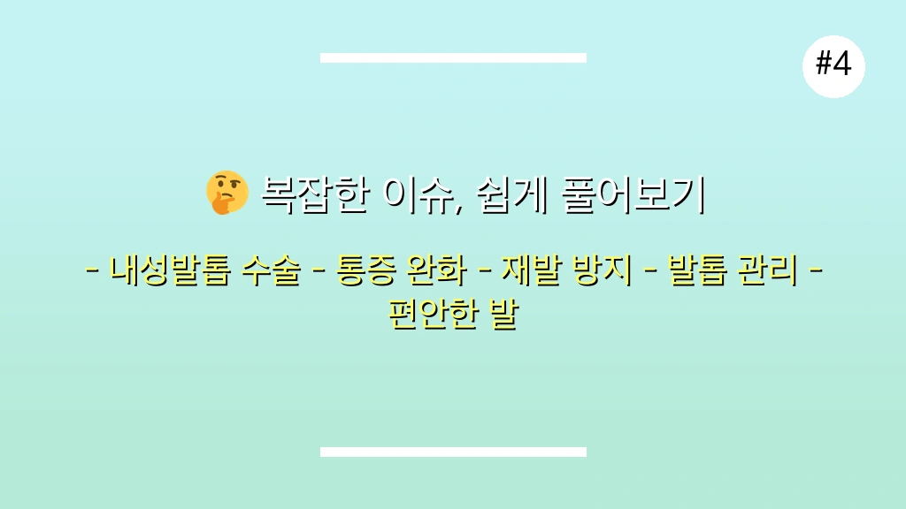 💡 개인적 견해: 내성발톱 수술은 두려움의 대상이 아니라, 고통스러운 증상으로부터 벗어나 더 나은 삶을 위한 필수적인 과정일 수 있습니다. 망설이기보다는 정확한 진단과 상담을 통해 자신에게 맞는 최적의 치료법을 선택하는 것이 현명합니다.