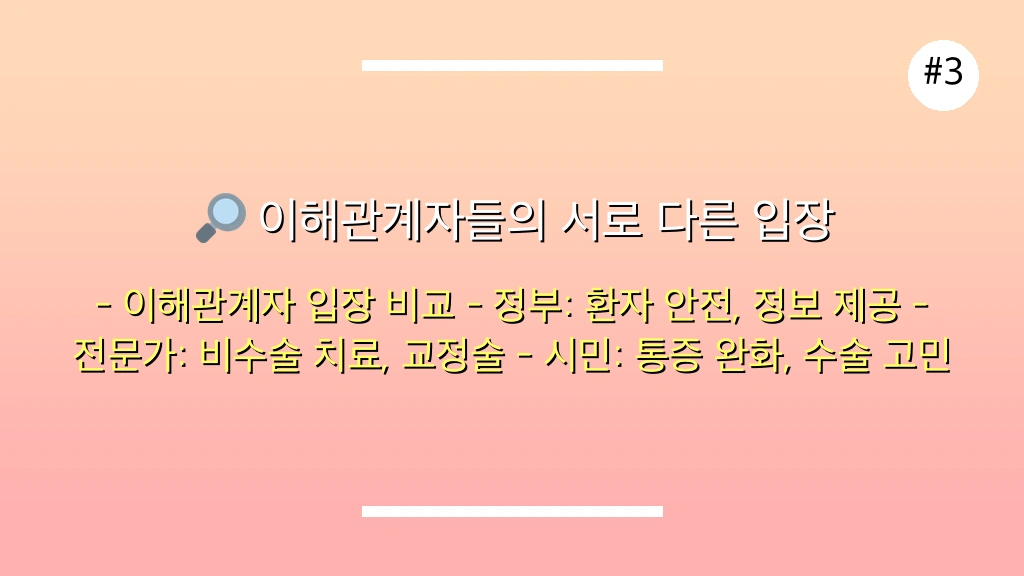 여론 동향: 통증으로 일상생활에 불편을 겪으며, 비수술적 방법으로 해결되기를 바라지만 효과가 없을 경우 수술을 고려.