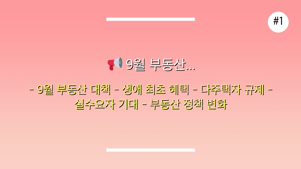 생애 최초 주택 구매자 혜택 강화부터 다주택자 규제까지, 9월 발표된 부동산 대책에는 다양한 방안들이 포함되어 있습니다. 특히 실수요자들의 내 집 마련에 대한 기대감을 높이는 내용들이 눈에 띕니다.