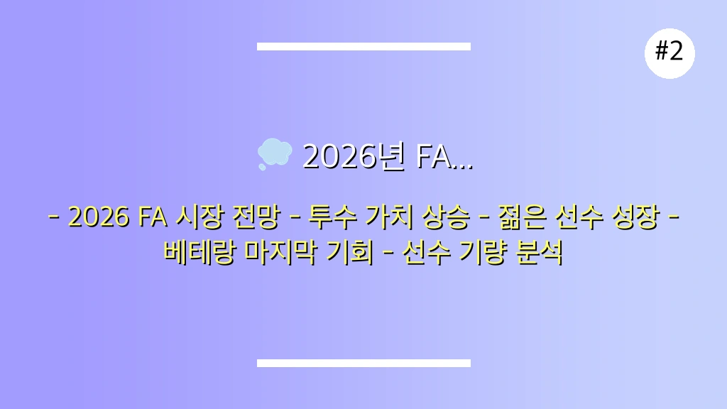 2년 후의 FA 시장을 예측하는 것은 많은 변수 때문에 쉽지 않습니다. 하지만 지금까지의 FA 시장 흐름과 각 팀의 선수단 구성을 살펴보면 대략적인 윤곽을 파악할 수 있습니다. 특히 최근 FA 시장에서 투수들의 가치가 지속적으로 상승하고 있다는 점은 2026년에도 이어질 가능성이 높습니다.