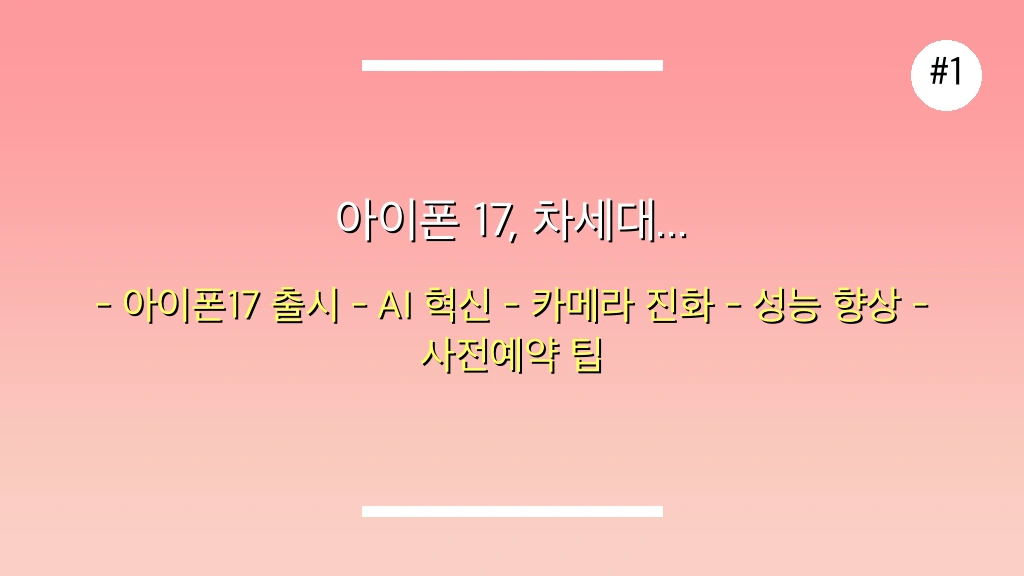 2025년 가을, 애플은 아이폰 17 시리즈를 통해 사용자 경험의 새로운 지평을 열 준비를 하고 있습니다. AI 기술과의 융합, 혁신적인 카메라 시스템, 그리고 더욱 강력해진 성능은 우리의 디지털 라이프스타일을 어떻게 변화시킬까요? 이번 분석에서는 아이폰 17의 예상되는 주요 특징과 한국 출시 전망, 그리고 성공적인 사전예약을 위한 팁까지 상세하게 다룹니다.