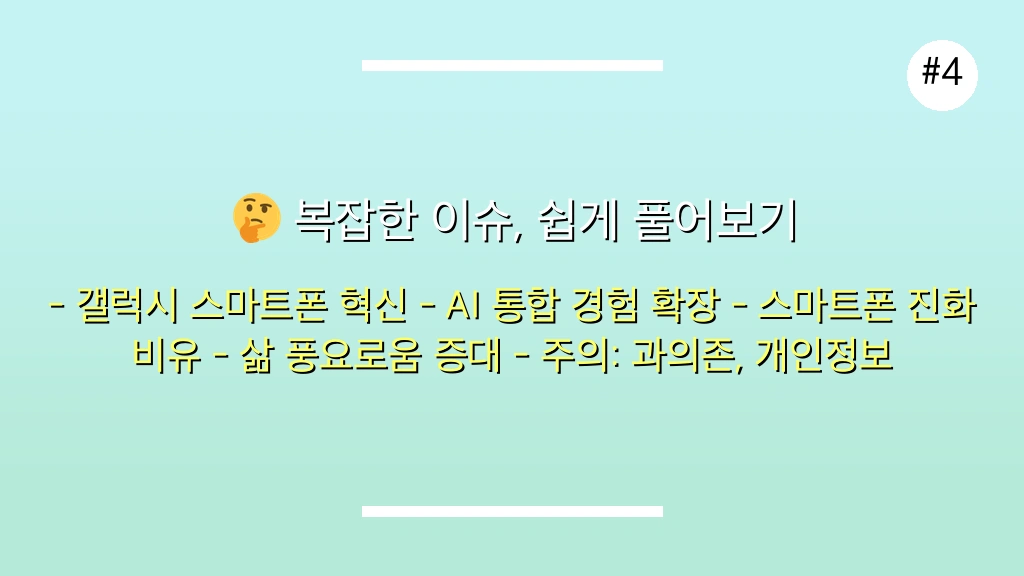 이 상황을 스마트폰의 '진화'에 비교하면 이해하기 쉽습니다. 마치 새로운 기능과 더 나은 성능을 갖춘 '차세대 자동차'가 계속해서 출시되는 것처럼, 갤럭시 또한 끊임없이 발전하며 우리의 삶을 더욱 풍요롭게 만들고 있습니다. 예를 들어, 처음 휴대폰이 단순 통화 기능만 제공하다가 카메라, 인터넷까지 가능해진 것처럼, 이제는 스마트폰이 우리의 '생활 비서' 역할을 하게 되는 것이죠.