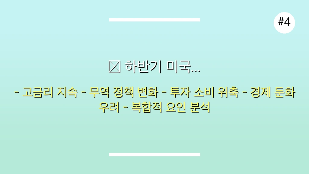 2025년 하반기 미국 경제에는 몇 가지 주요 변수가 존재합니다. 고금리 환경의 지속과 잠재적인 무역 관련 정책 변화(관세 인상 등)는 기업 투자와 소비 심리에 영향을 줄 수 있습니다. 따라서 이러한 외부 요인들을 면밀히 주시하며 경제 상황을 다각적으로 분석하는 것이 중요합니다.