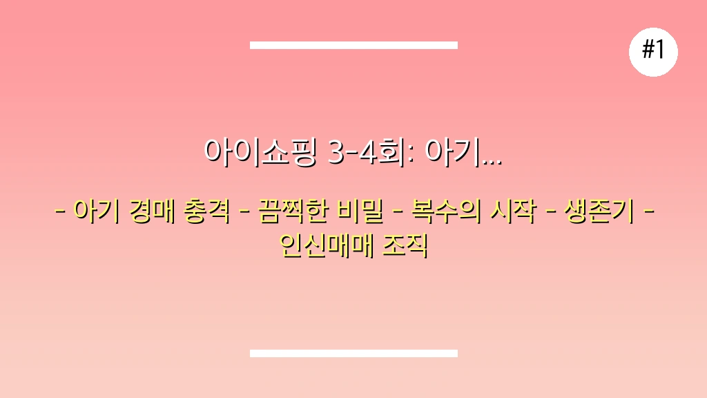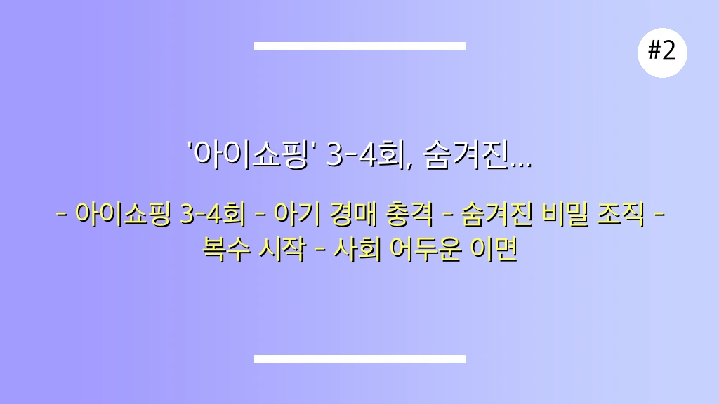 💡 아이쇼핑 3-4회 핵심 요약: 아기 경매 현장의 충격적인 실태와 주인공들의 복수 계획이 본격화되는 에피소드입니다.
