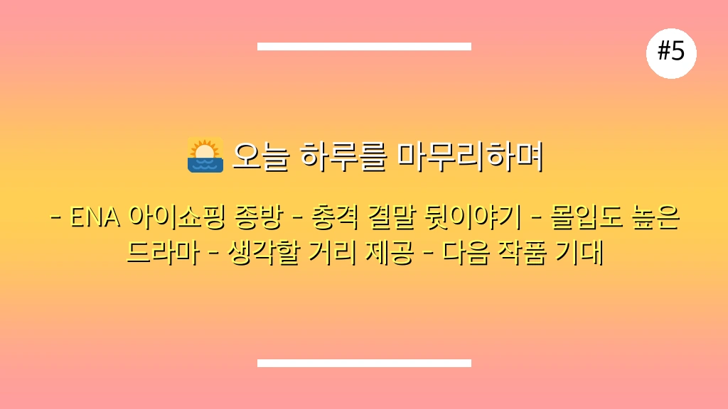 오늘 ENA 드라마 '아이쇼핑'의 충격적인 결말과 뒷이야기들을 깊이 있게 나눠보는 정말 몰입도 높은 시간을 보냈습니다. 비록 드라마의 내용은 매우 어둡고 무거웠지만, 그만큼 많은 생각과 성찰의 기회를 준 작품이었습니다. 앞으로 또 어떤 흥미로운 작품들을 만나게 될지 기대하며 오늘 하루를 마무리합니다. 다음에 더욱 재미있는 이야기로 돌아오겠습니다!