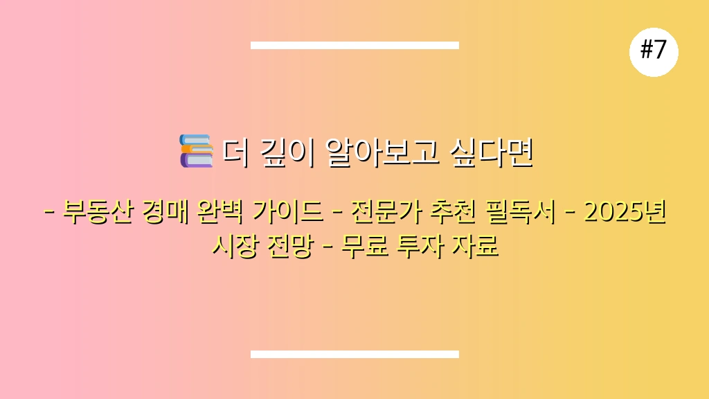 💡 개인적 견해: 부동산 경매는 마라톤과 같습니다. 단기적인 수익보다 장기적인 안목으로 차근차근 기본기를 다져나간다면, 분명 좋은 결실을 맺을 수 있을 것입니다. 처음에는 작은 물건부터 시작하여 경험을 쌓아가는 것을 추천합니다.
