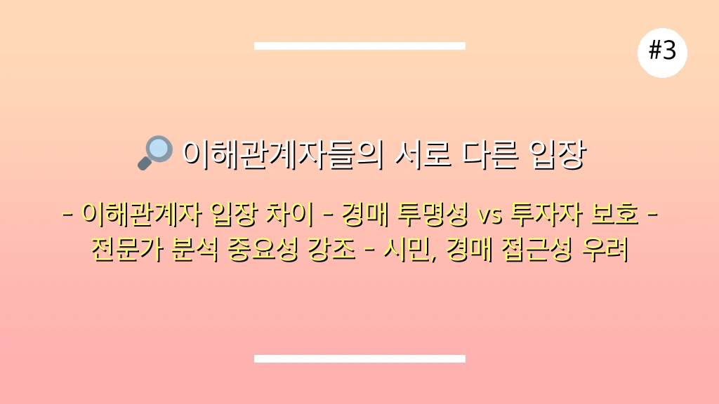 주요 입장: 경매 시장의 투명성과 공정성 확보, 투자자 보호를 위한 제도 마련