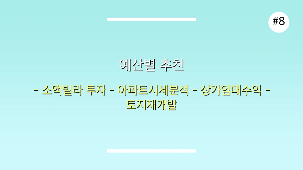 소형 빌라, 상가 점포 등: 소액으로 접근 가능하며, 비교적 명도 및 관리가 용이한 물건을 찾아보세요. 지역 분석을 통해 상승 가능성 있는 곳에 투자하는 것이 좋습니다.