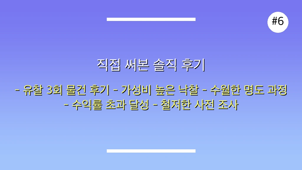 - 편의성: 물건의 명확한 하자로 인해 경쟁이 적어 명도 과정도 비교적 수월하게 진행.