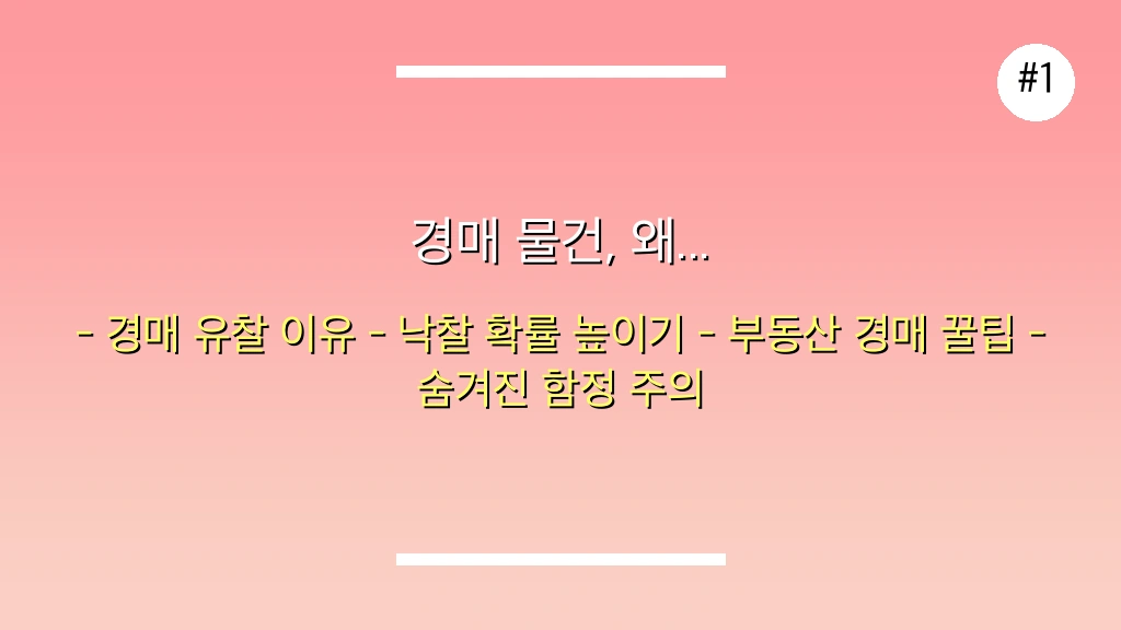 부동산 경매 참여 시 '이 좋은 물건이 왜 이렇게 계속 유찰되지?'라는 의문은 흔합니다. 처음 경매에 발을 들였을 때, 좋은 조건의 물건들이 연달아 유찰되는 것을 보며 혼란스러웠던 기억이 있습니다. 하지만 철저한 조사와 경험을 통해 그 숨겨진 이유를 파악하고, 실제로 낙찰 확률을 높이는 전략을 터득했습니다. 오늘은 많은 분들이 궁금해하는 경매 물건 유찰의 근본적인 원인과 성공적인 경매 투자를 위한 실질적인 꿀팁들을 공유해 드립니다.