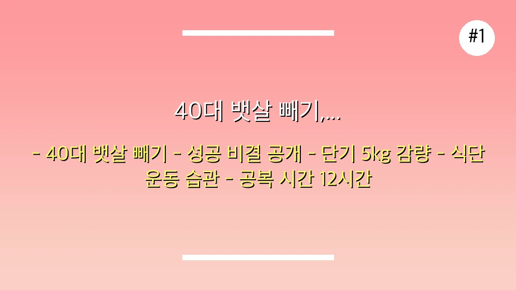 40대가 되면서 늘어나는 뱃살 때문에 고민이신가요? 좌절은 금물! 올바른 식단과 꾸준한 운동, 그리고 몇 가지 생활 습관 개선만으로도 단기간 5kg 감량은 충분히 가능합니다. 이 글에서는 40대 뱃살을 효과적으로 빼는 완벽 가이드를 제공하며, 성공적인 감량을 위한 구체적인 방법들을 알려드립니다.
