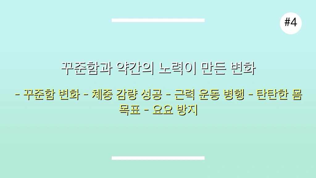 하지만 몸이 가벼워지고 옷 사이즈가 줄어드는 놀라운 변화를 경험하면서, 초기의 어려움은 금세 잊혔습니다. 이제는 단순히 살을 빼는 것을 넘어, 근력 운동을 병행하여 탄탄한 몸을 만드는 것을 목표로 하고 있습니다. 근육량 증가는 기초대사량 향상과 요요 방지에 큰 도움이 될 것이라 믿습니다.