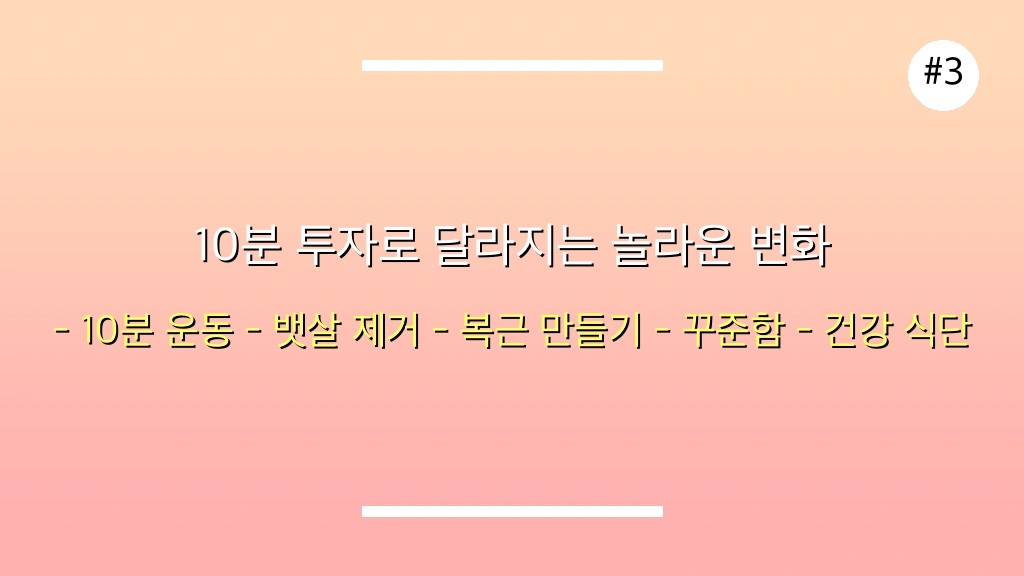 다가오는 봄, 얇아지는 옷에 신경 쓰이는 뱃살 때문에 고민이신가요? '하루 10분 투자로 탄탄한 복근 만들기'라는 문구를 보며 '정말 가능할까?' 반신반의했지만, 꾸준히 운동하지 않아도 효과를 볼 수 있는 현실적인 방법을 찾아봤습니다. 아침 10분 투자가 여성의 복부 지방 감소와 혈압 개선에 긍정적인 영향을 준다는 연구 결과도 있답니다. 이제 '매일 아침 10분'을 당신의 건강 루틴으로 만들어보세요!
