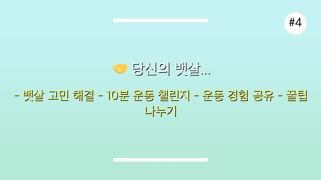 혹시 뱃살 때문에 고민이거나, 10분 투자로 놀라운 변화를 경험한 분이 있다면 댓글로 어떤 운동을 어떻게 꾸준히 하셨는지 공유해주세요! 서로의 경험을 나누며 꿀팁을 공유하는 것은 큰 힘이 될 것입니다. 여러분의 소중한 경험을 기다립니다!