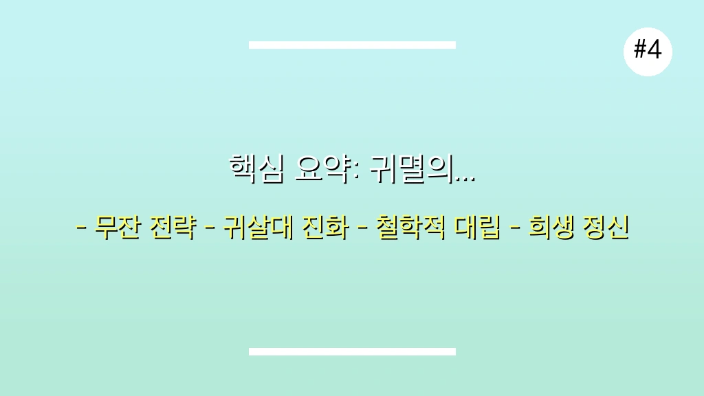 무잔과 귀살대의 최종 전투는 단순한 생존 싸움을 넘어, 영원한 삶을 갈망하는 무잔과 그에 맞서는 귀살대의 숭고한 희생이 맞물리는 철학적 갈등의 장이었습니다. 특히 오브야시키 가문과의 오랜 대립 구도는 생명의 본질에 대한 깊은 질문을 던집니다. 무잔은 불멸을 꿈꾸지만, 결국 그 또한 인간이기에 피할 수 없는 한계를 드러내며 파멸을 맞이합니다.