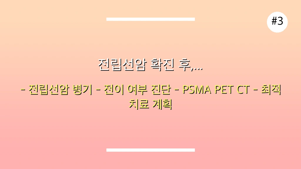전립선암이 확진되면, 암의 병기(진행 정도)와 전이 여부를 정확히 파악하는 것이 매우 중요합니다. 이를 위해 골 스캔이나 PSMA PET-CT와 같은 정밀 영상 진단을 시행하여 뼈 전이 여부, 림프절 전이 등을 면밀히 확인합니다. 이러한 정보는 최적의 치료 계획을 수립하는 데 필수적입니다.