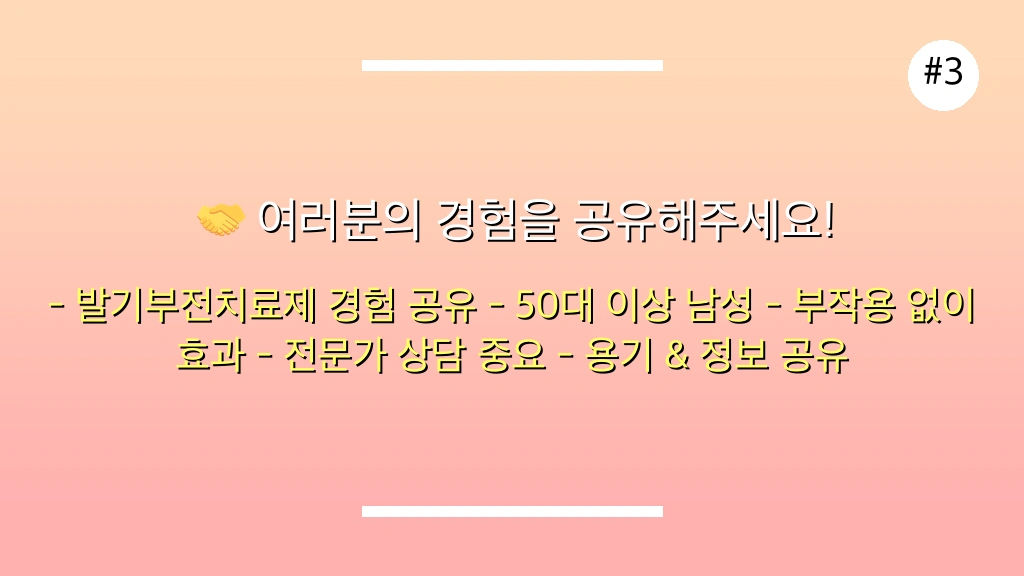 50대 남성으로서 발기부전치료제를 경험하며 겪었던 솔직한 경험담과 부작용 없이 효과를 본 방법을 모두 공개합니다. 더 이상 고민하지 마세요!