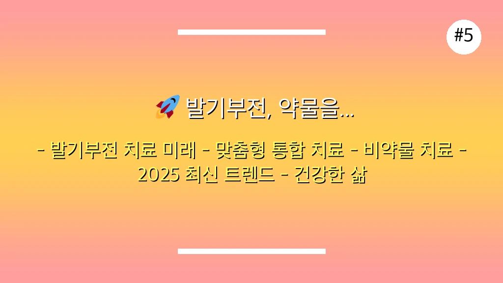 ", "tags": ["발기부전", "발기부전 치료", "비약물 치료", "2025년 최신 정보", "생활습관 개선", "운동 치료", "정신건강"], "meta_description": "2025년, 발기부전 치료는 약물만이 답이 아닙니다. 운동, 생활습관, 정신건강 관리 등 숨겨진 대안 치료법과 최신 정보를 총정리하여 알려드립니다.", "featured_snippet_target": "발기부전은 약물 외에도 운동, 생활습관 개선, 정신건강 관리 등 다양한 대안 치료법으로 효과적으로 관리될 수 있습니다. 2025년에는 개인 맞춤형 통합 치료가 중요해지고 있습니다'건강' 카테고리의 다른 글