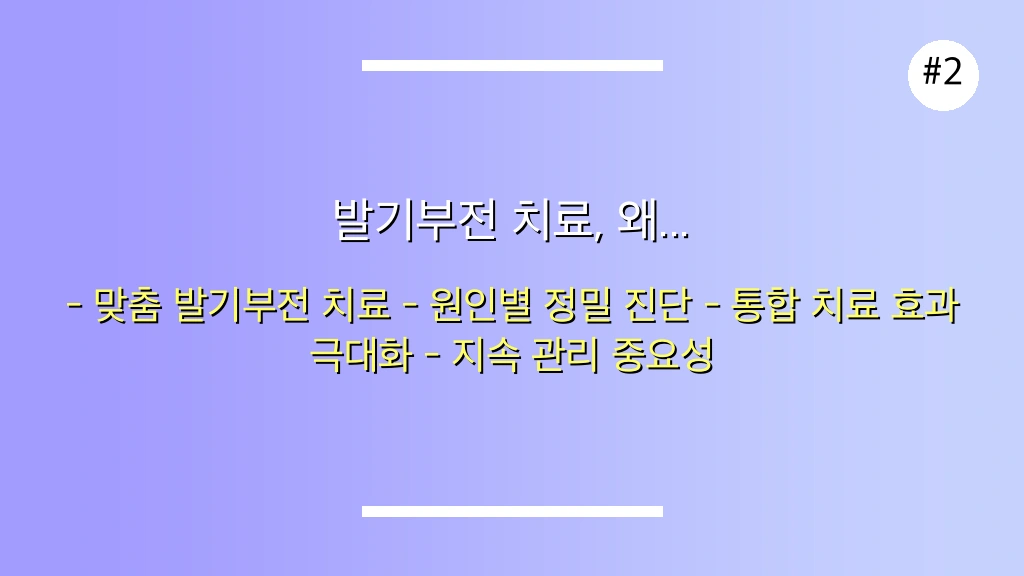 A: 약물 치료 외에도 주사 치료, 체외충격파 치료, 수술적 방법, 심리 상담 등 다양한 치료법이 존재합니다. 개인의 상태와 선호도에 맞는 최적의 방법을 선택하는 것이 중요합니다.