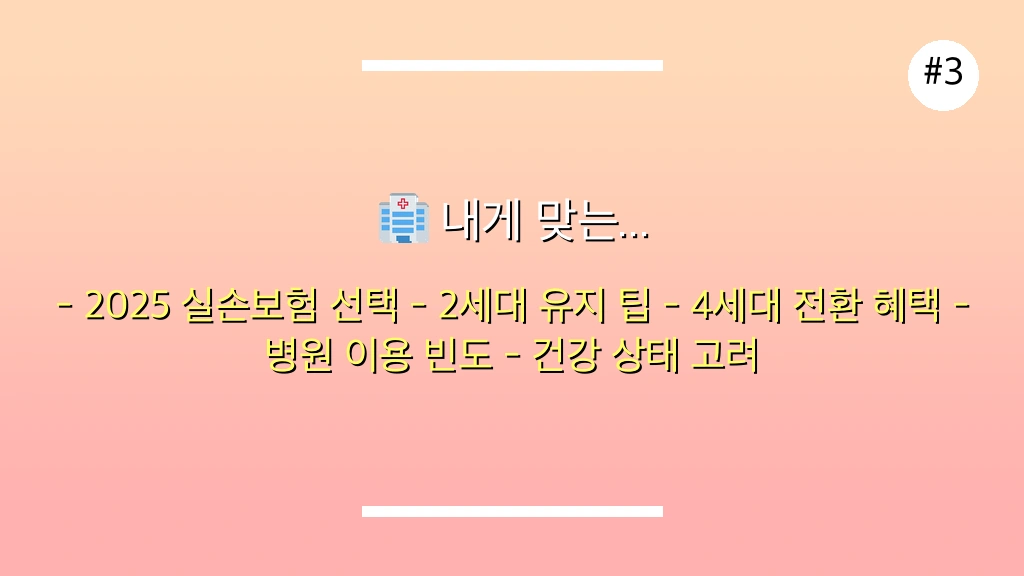 나에게 맞는 실손보험을 선택하기 위해서는 나의 건강 상태, 병원 이용 빈도, 그리고 보험료 지불 능력을 종합적으로 고려해야 합니다. 다음은 2025년 기준으로 여러분의 상황에 맞는 실손보험을 선택하는 데 도움을 줄 실용적인 가이드입니다.