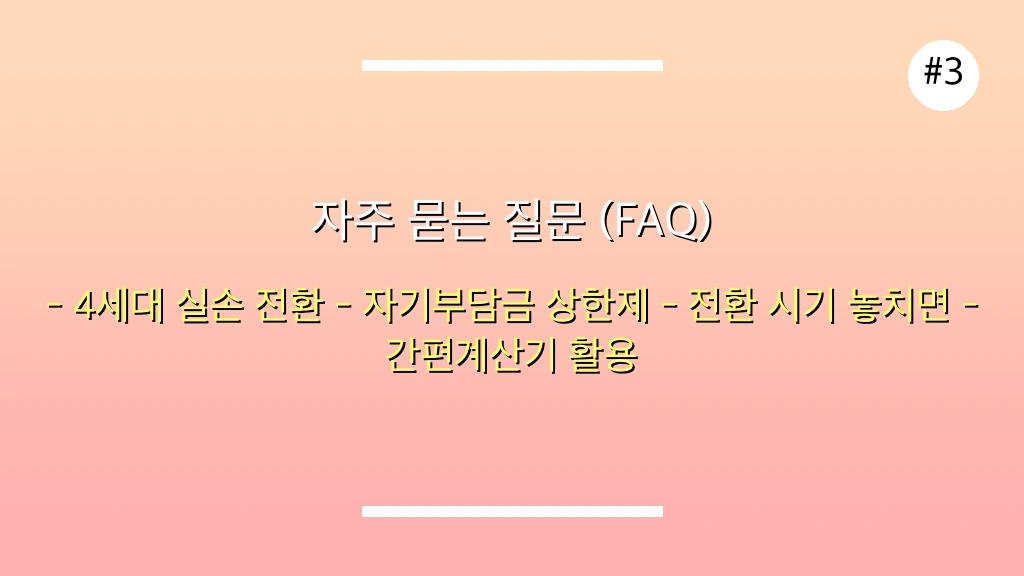 A: 전환 시기를 놓치면 기존 1~3세대 실손보험의 보험료가 계속 인상될 가능성이 높습니다. 4세대 실손보험으로 전환할 기회가 사라져 경제적으로 불리해질 수 있습니다. 각 보험사별 전환 가능 기간을 반드시 확인해야 합니다.